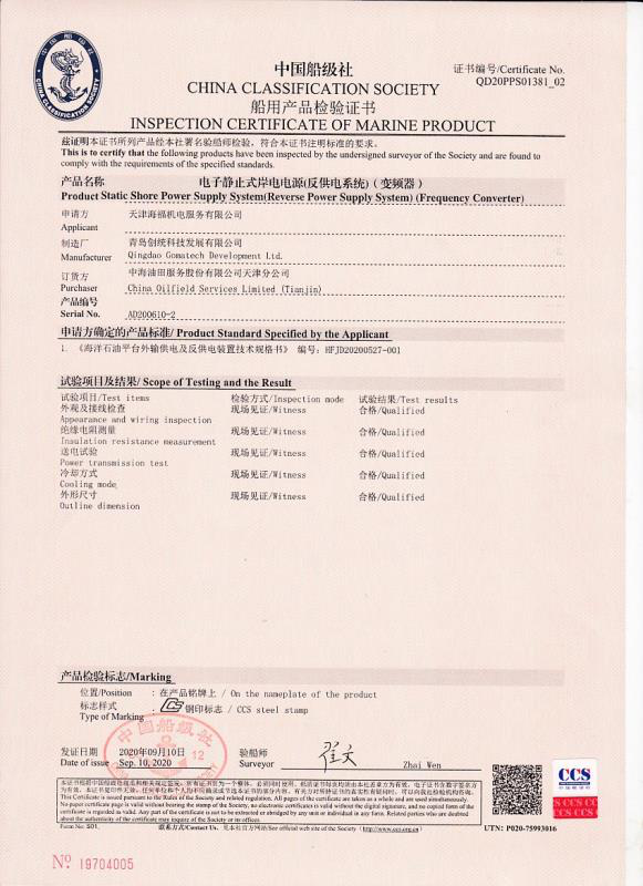 岸電設(shè)備通過(guò)了中國(guó)船級(jí)社認(rèn)證并獲得認(rèn)證證書(shū),獲得國(guó)家電力電子產(chǎn)品質(zhì)量監(jiān)督檢驗(yàn)中心檢測(cè)證書(shū)。